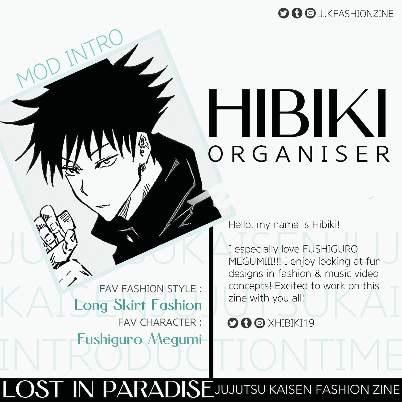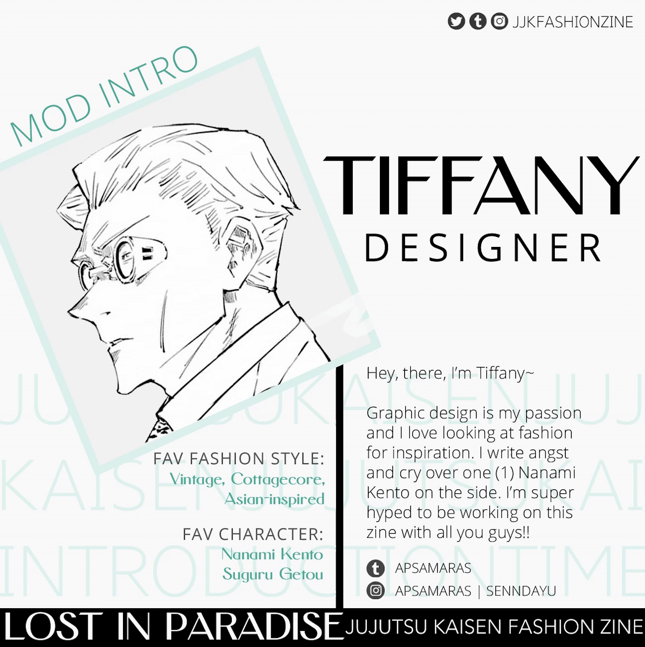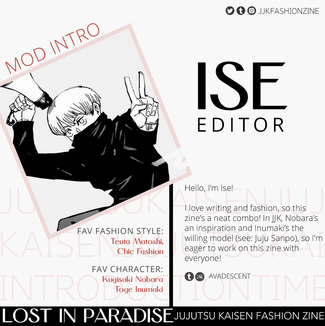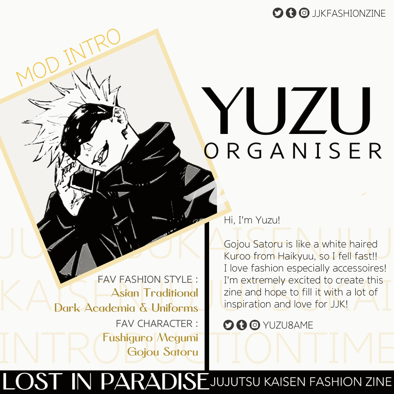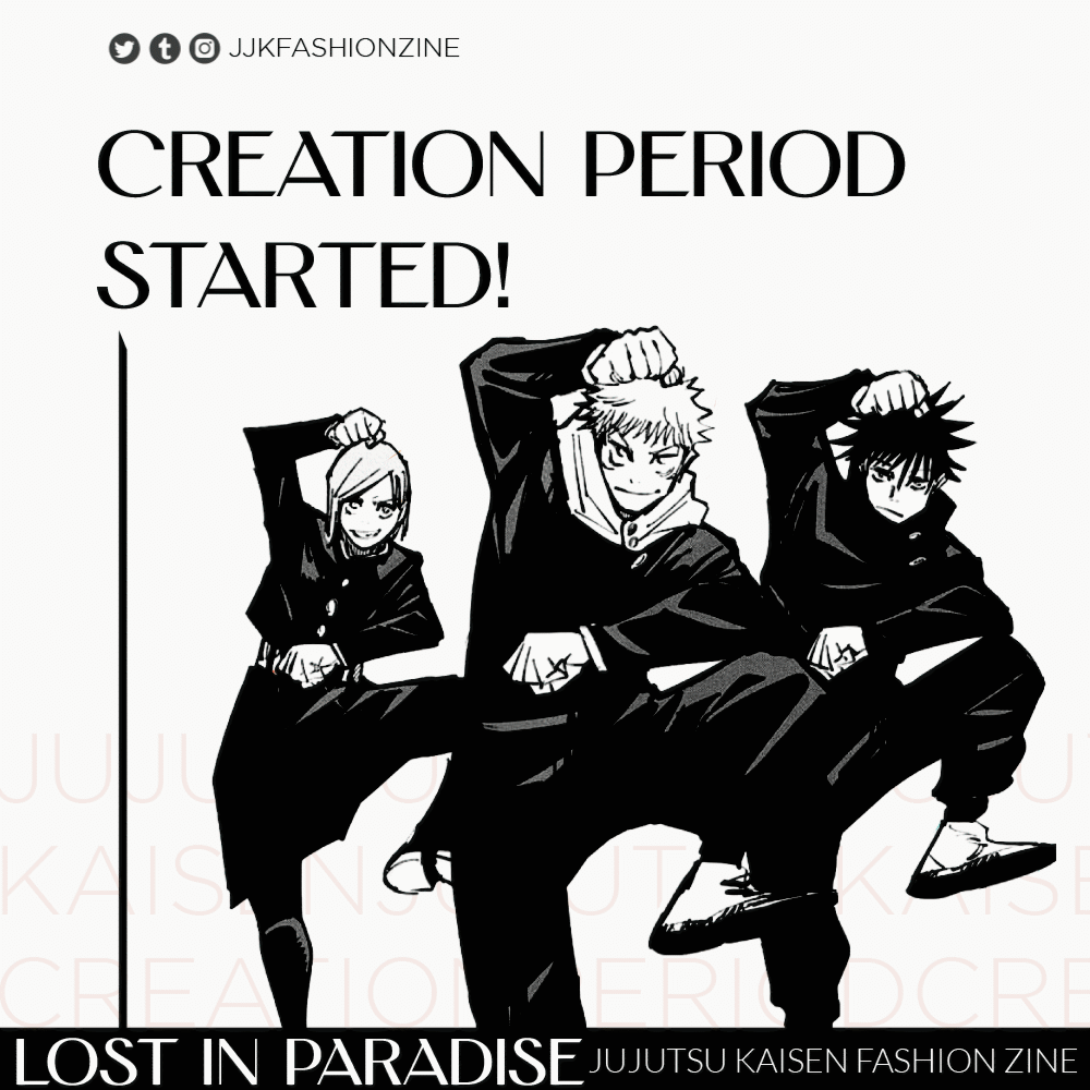 Lost in Paradise is a JJK fashion zine with more than 100+ pages of art and writings, featuring characters in various fashion styles from street wear, formal wear, traditional wear and more!Lost in Paradise, a JJK Fashion zine is now available!